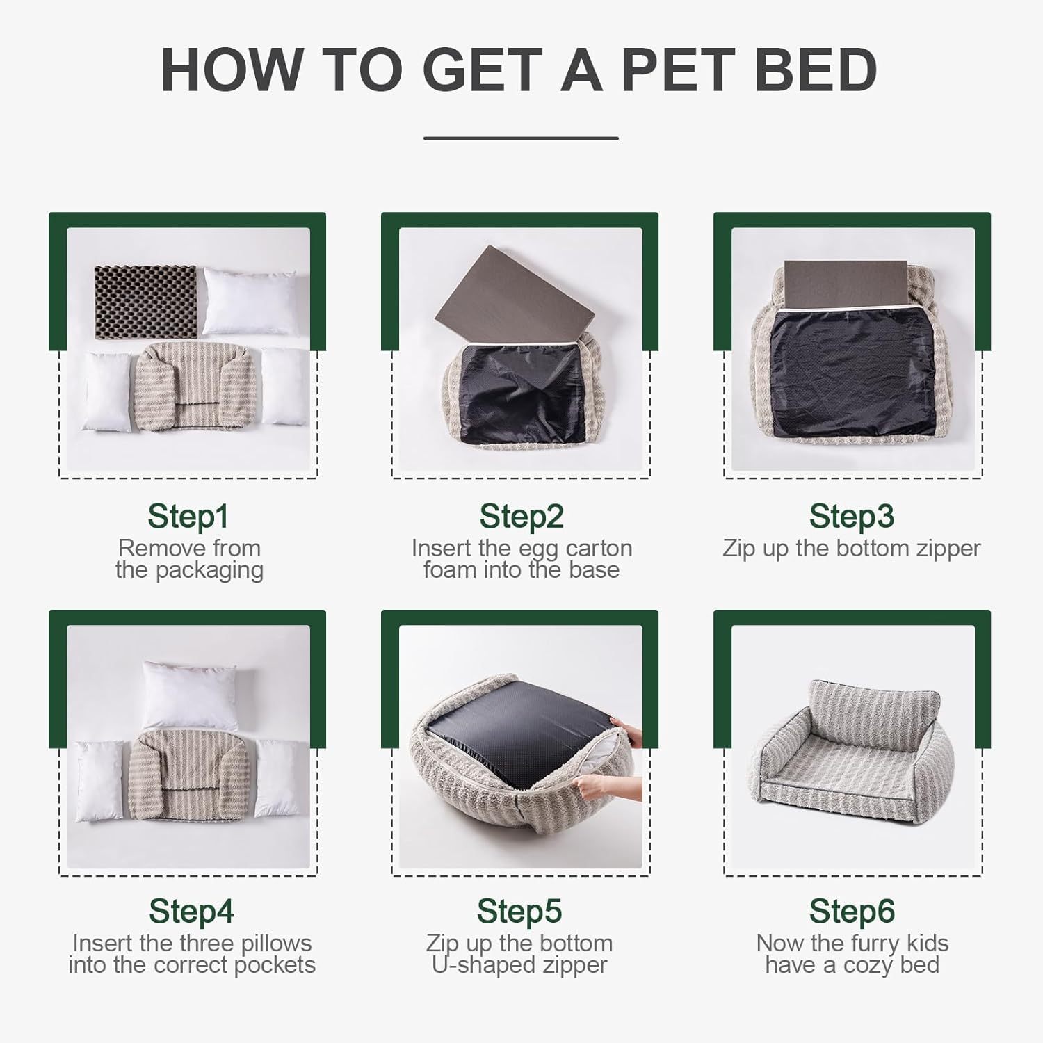 Simple Assembly: Assembly is quick and effortless—simply place the three pillows and foam mattress into the bed cover in sequence, zip it up, and voila! Your adorable pet bed is ready to use