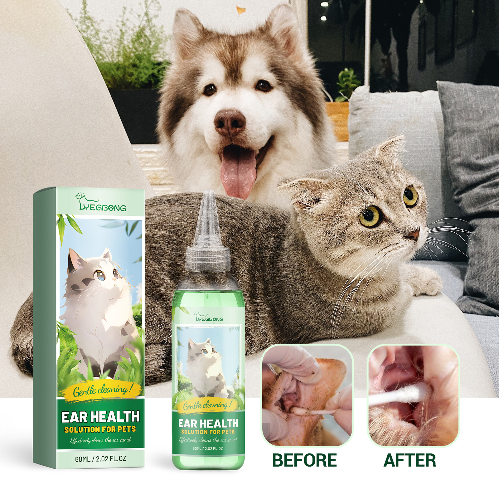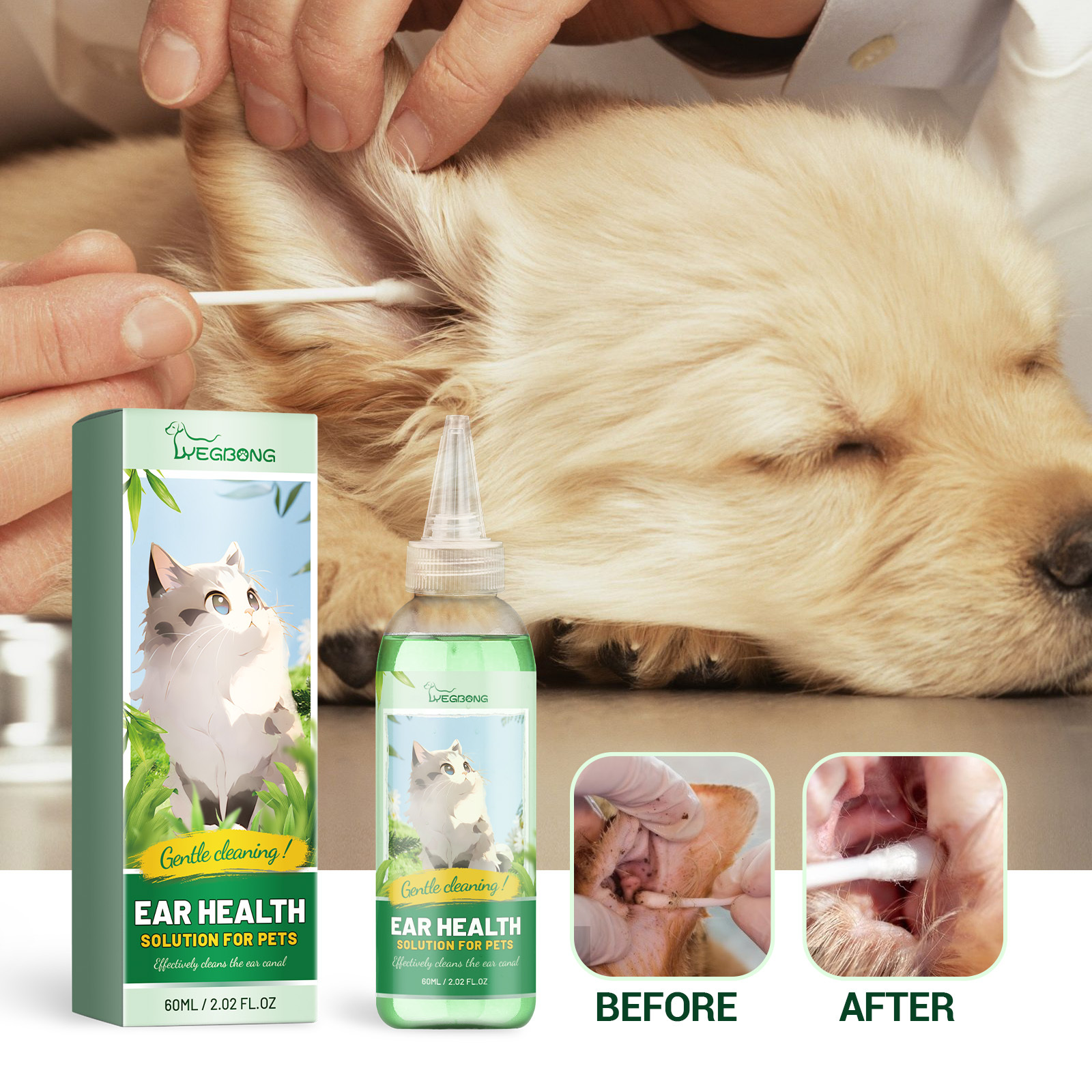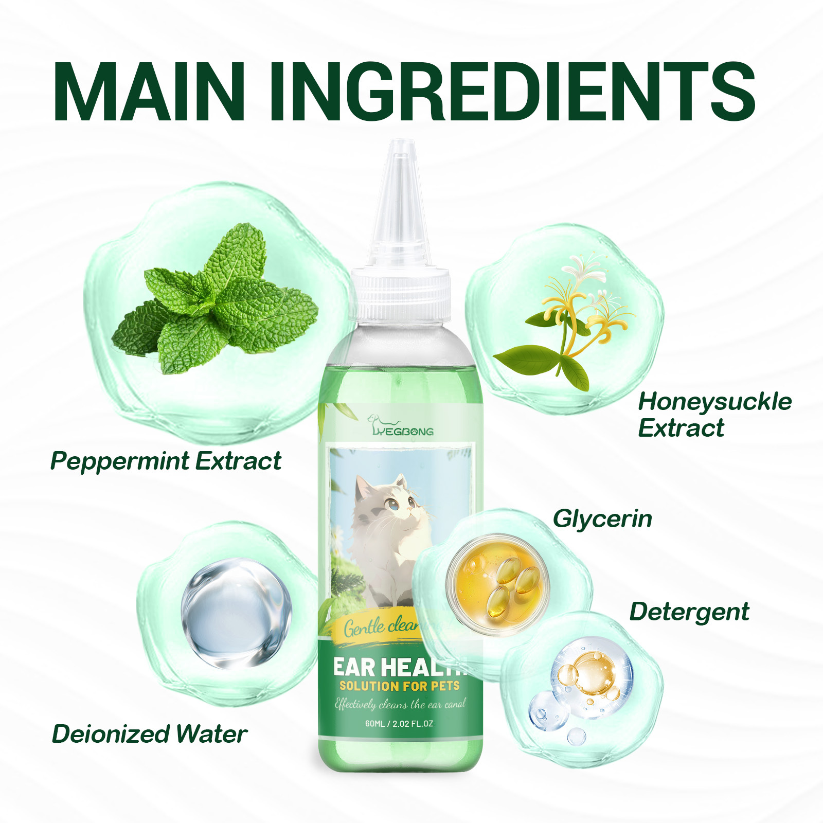 Our pet ear cleaning solution contains deionized water, peppermint extract, and honeysuckle extract. It can moisturize the ear canal, remove odors, and keep pet ear canals clean and fresh; Rich in cleaning factors, it can effectively clean pet ear canal dirt. Its usage is simple: put on gloves, dip a cotton swab in ear wash, and gently wipe the pet’s outer ear wall and ear canal. Pet ear cleaning solution effectively cleanses dirt by adding honeysuckle extract, leaving a faint fragrance after cleaning, allowing you to enjoy intimate contact with your pet.