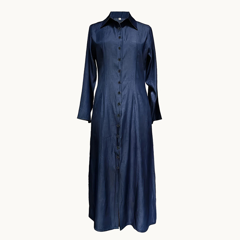 Step into effortless style with this versatile denim maxi dress that blends comfort with timeless appeal! This long sleeve button-down dress features a classic jean dress silhouette with functional side pockets , making it perfect for both casual outings and dressed-up occasions. The breathable denim fabric moves with you, while the long length drape creates a flattering fit.